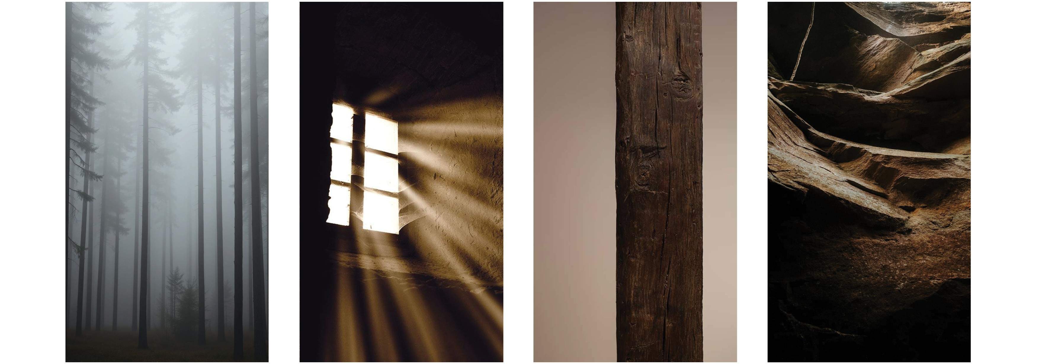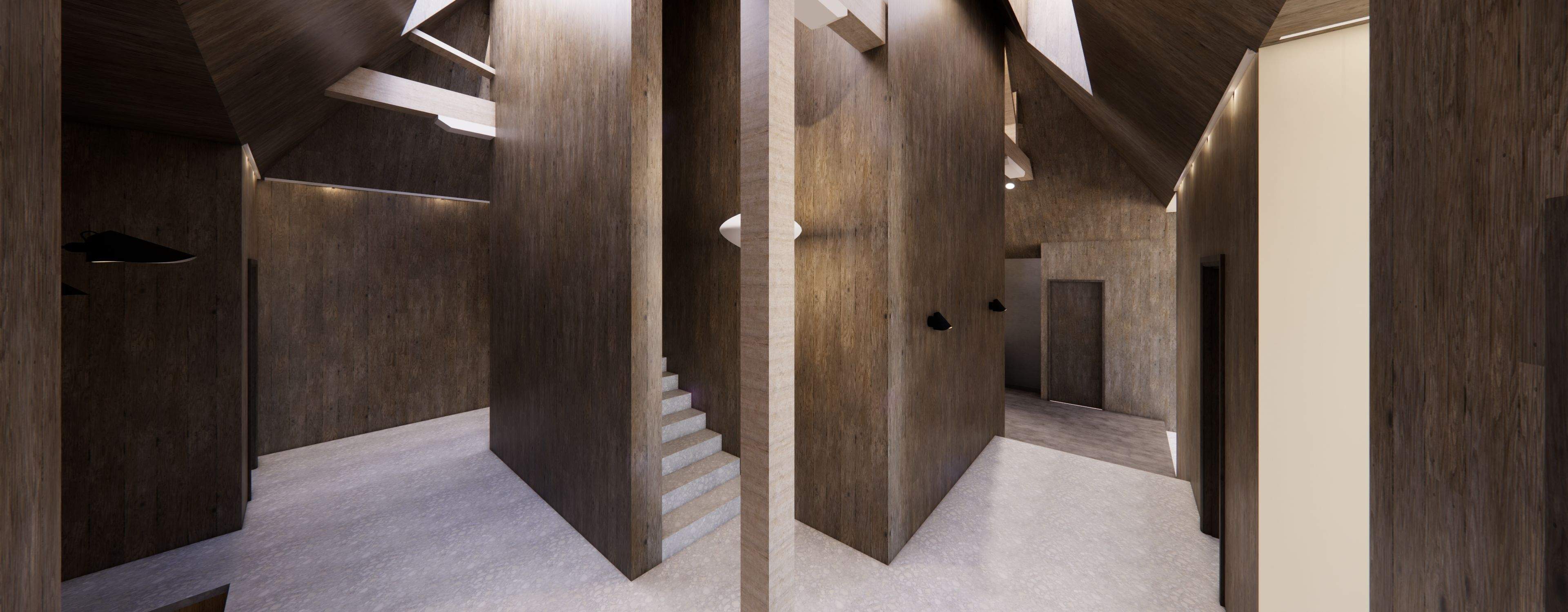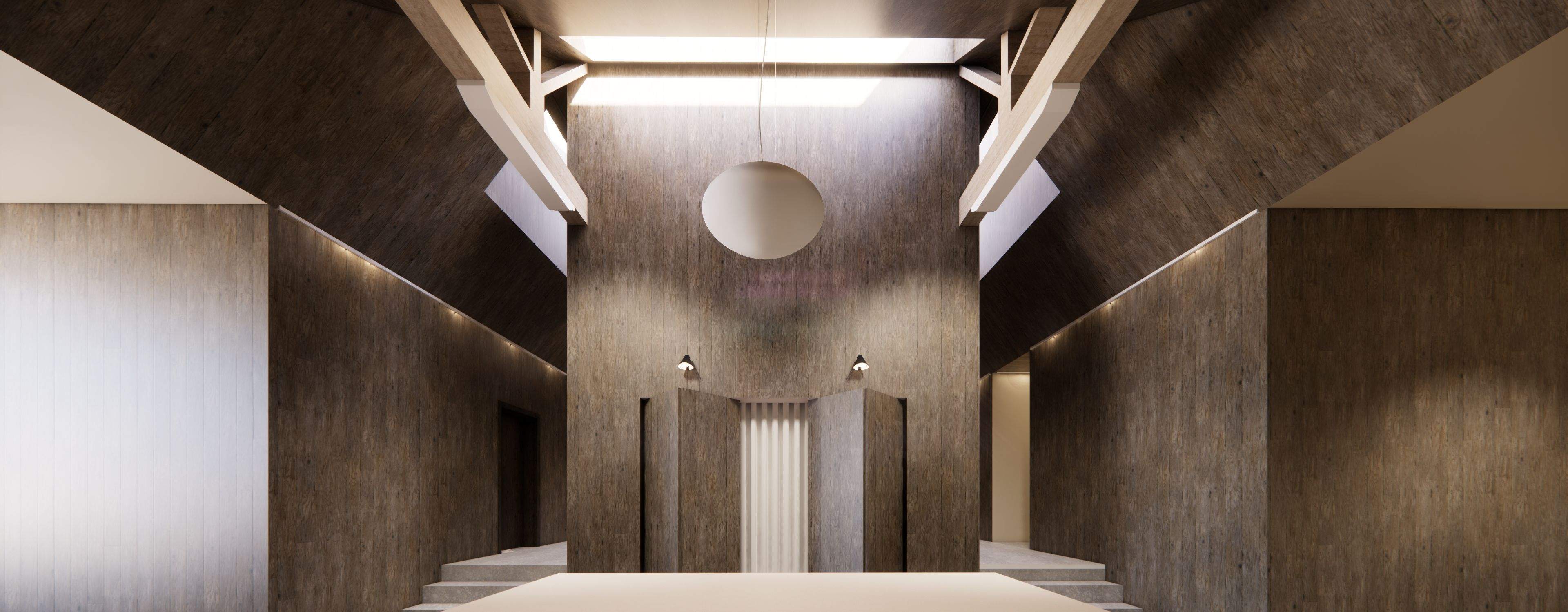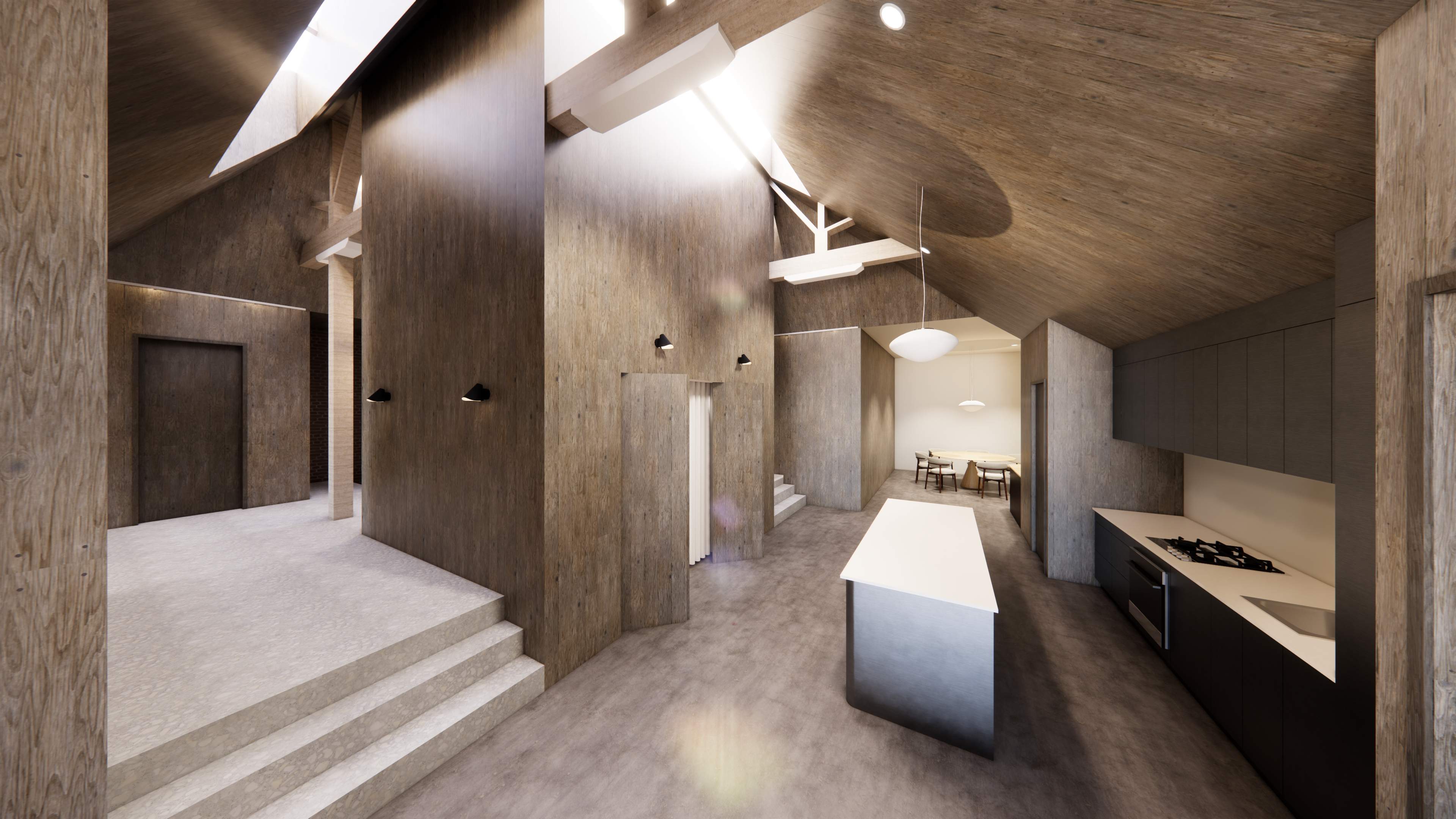 Clad in aged timber from floor to ceiling these panels pull focus to the skyights above. These tall ceilings allow light to fill the space whilst feeling open. Contrasted by a lower ceiling plane in the living and sleeping zones.